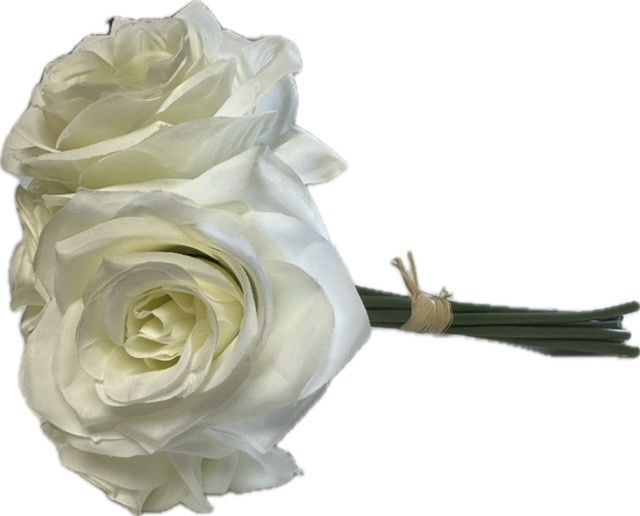 Open Rose bouquet has 7 single stems bound together with raffia ribbon. Can be used just as they are or can add other flowers or greenery. Makes a beautiful bridesmaid or bridal bouquet for wedding. This bouquet measures about 12" in height. The color is Cream.